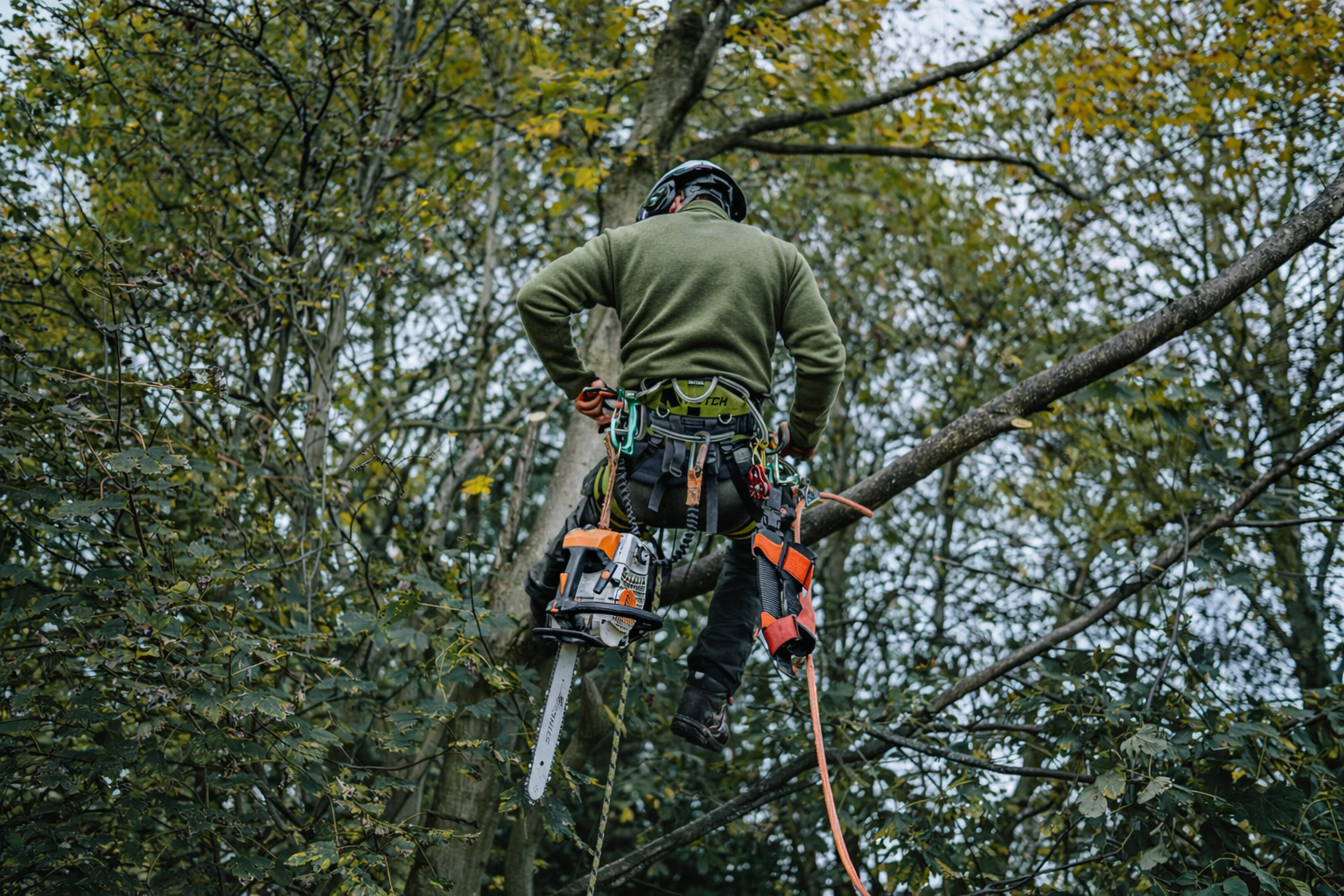 They use climbing harness systems, ropes, chainsaw protective gear, and sometimes mobile elevated platforms (MEWPs).